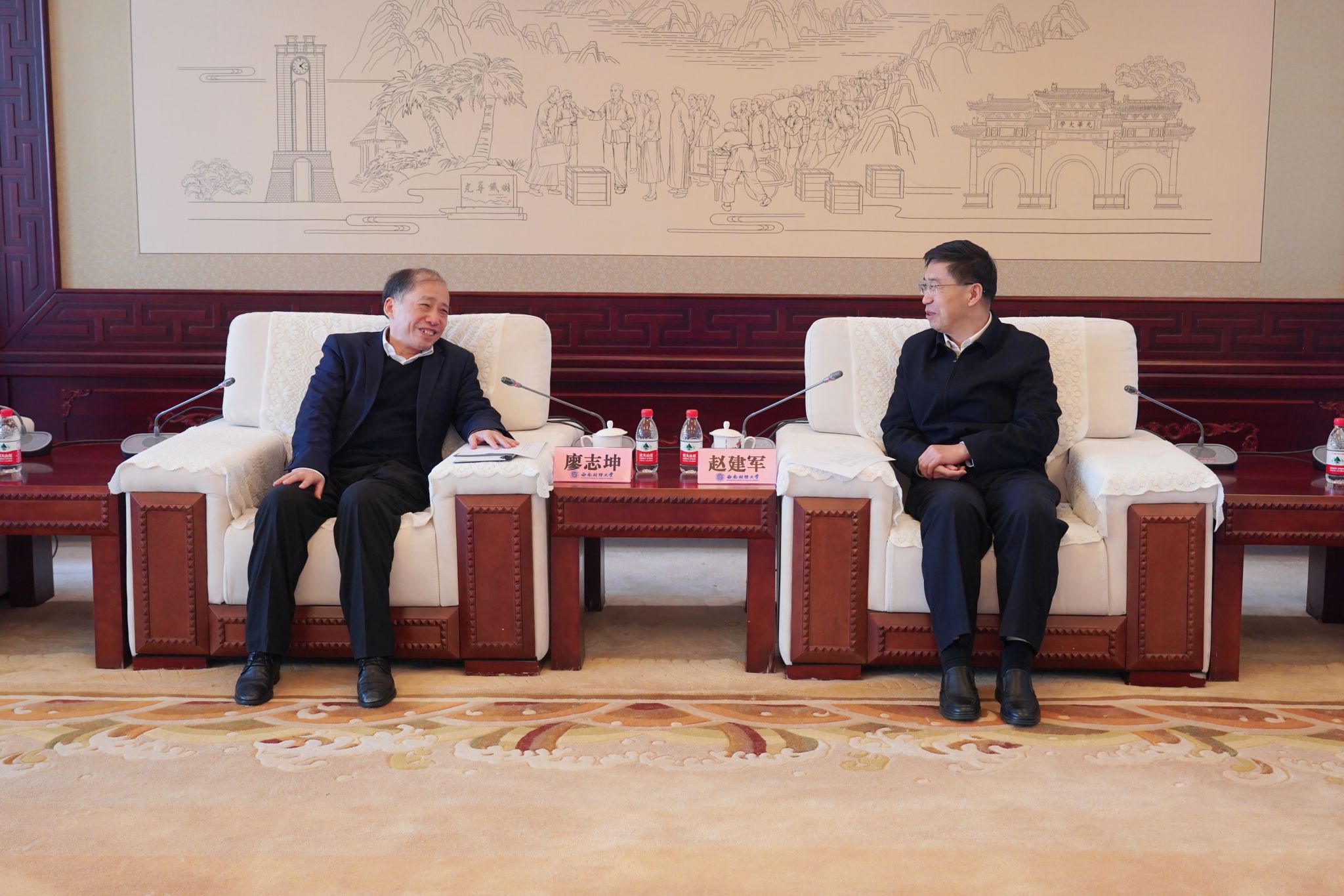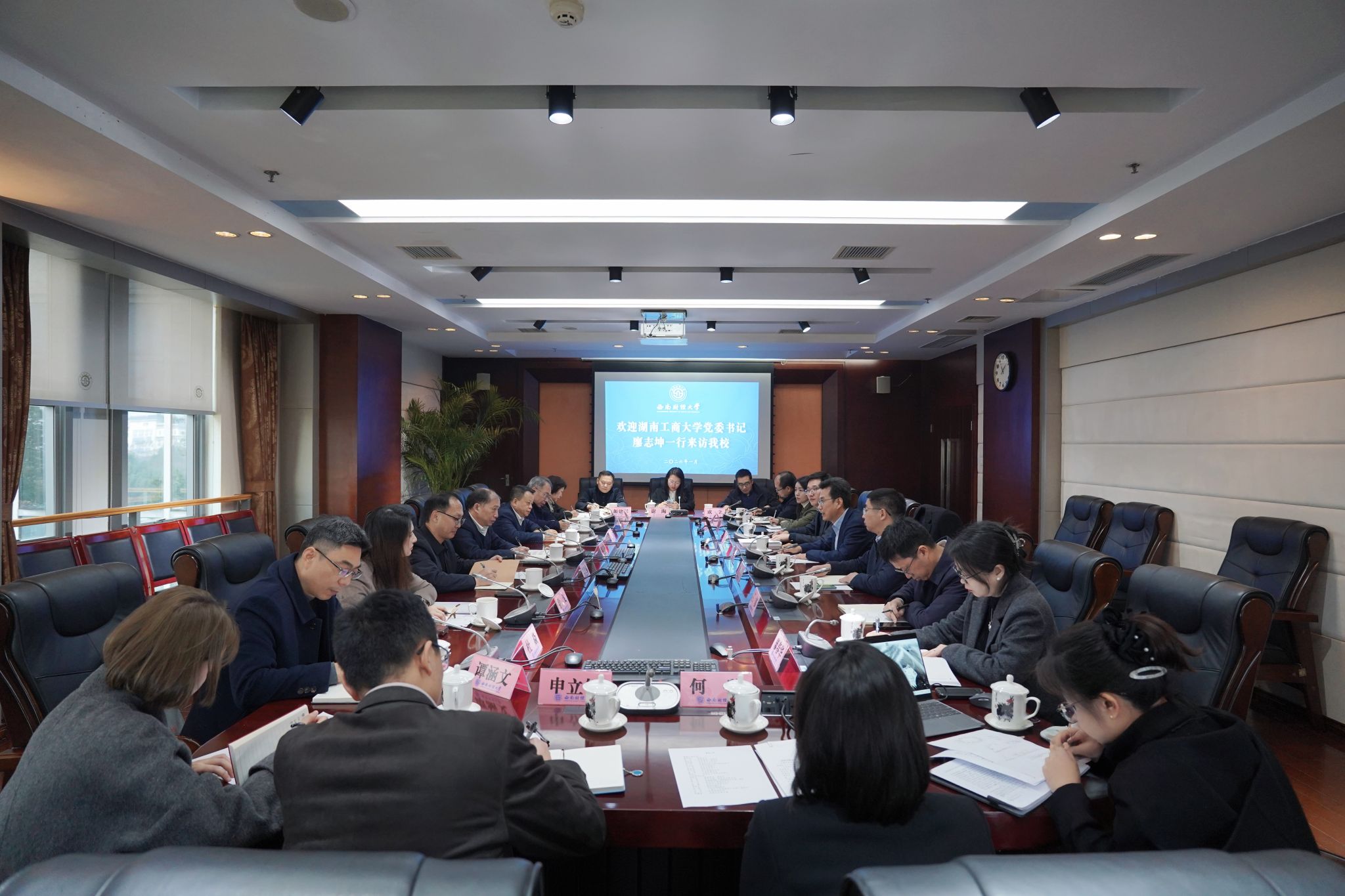 1月12日,湖南工商大学党委书记廖志坤一行来校调研交流。学校党委书记赵建军会见廖志坤一行,党委常委、副校长盖凯程参加座谈。