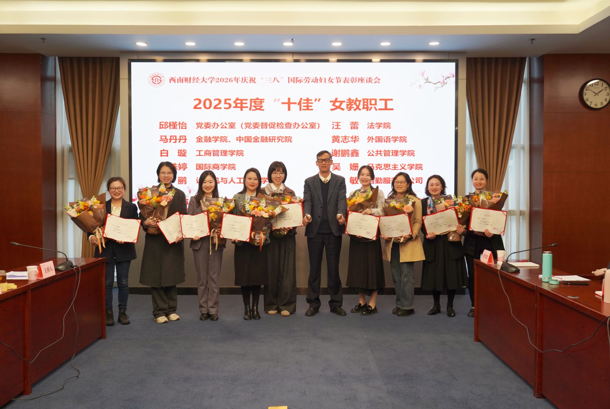 会上,党委常委、党委组织部部长梁婷宣读《关于表彰2025年度学校“十佳”女教职工的决定》,校领导为获奖先进个人颁发荣誉证书、献上节日鲜花。