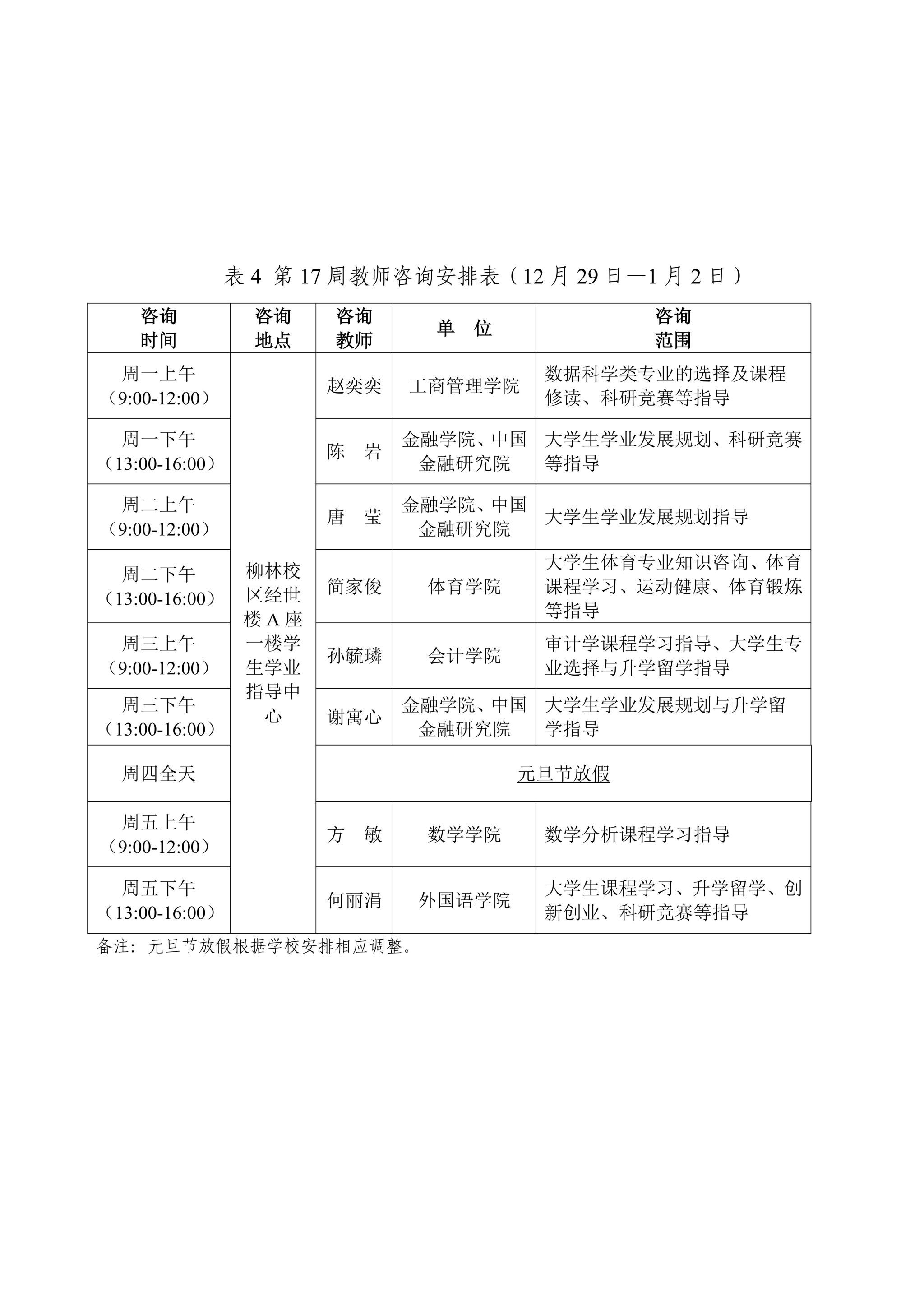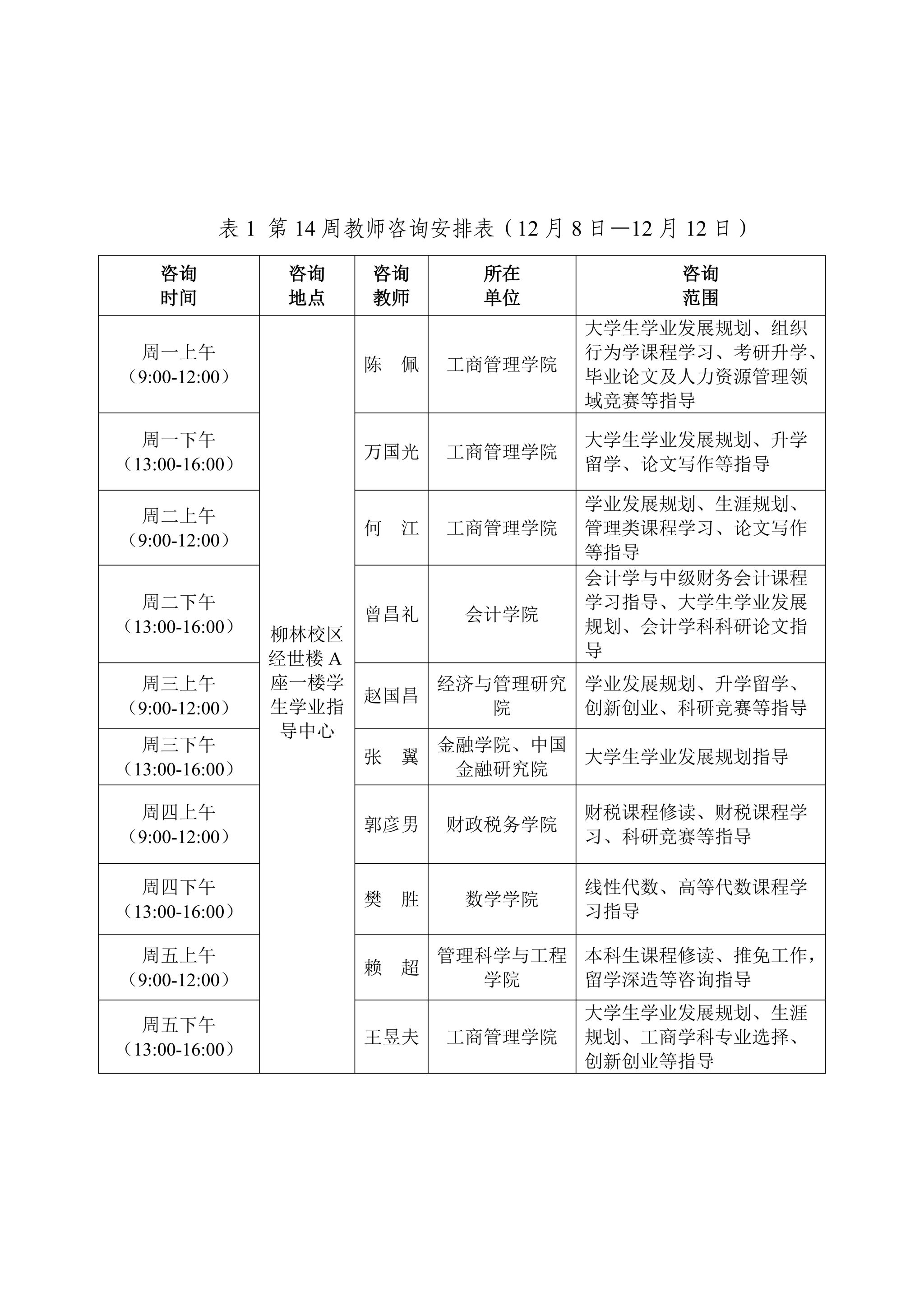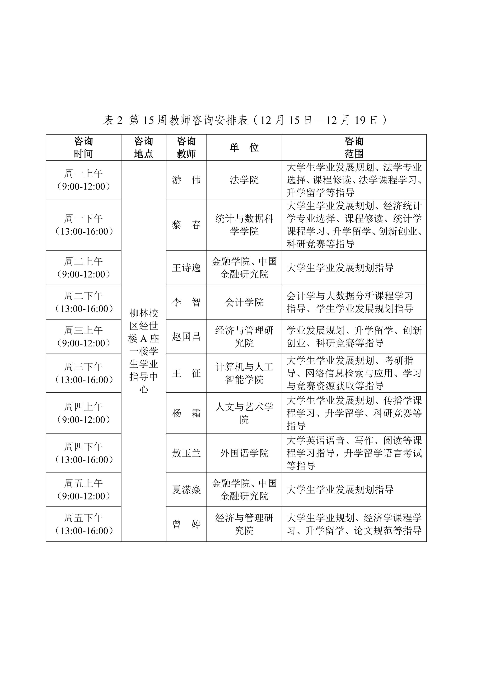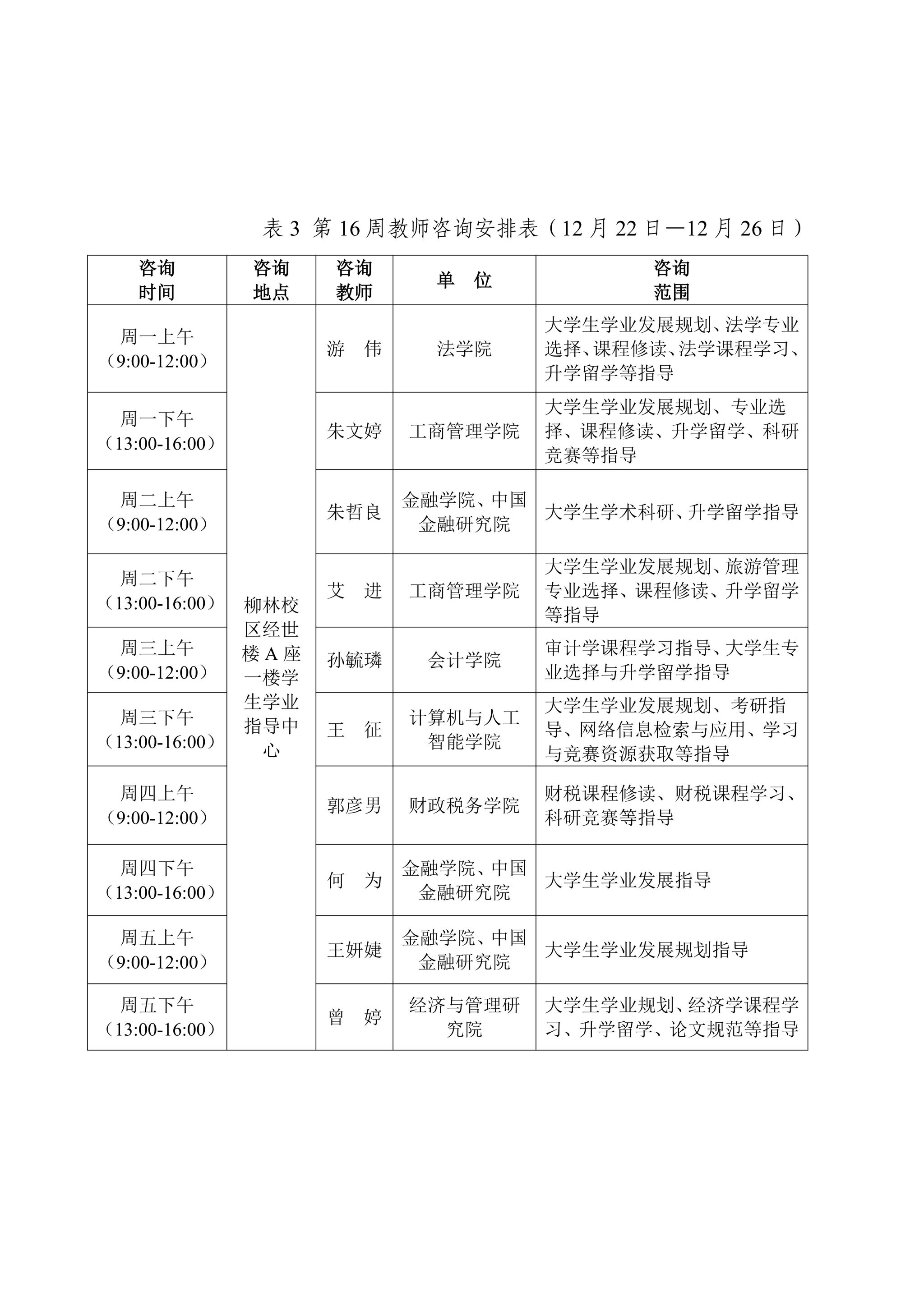为推进课程教学范式深彻转变,促进同学们学习理念、习惯、方式与时俱进,丰富大家在校学习体验,提供学科内容、学业流程等方面的咨询答疑,现将本学期第14至17周(12月8日—1月2日)教师咨询安排通知如下: