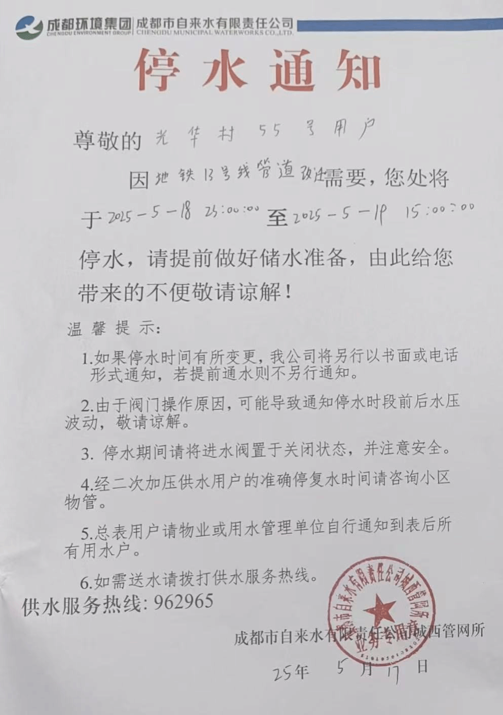 接成都市自来水有限公司通知,因地铁13号线管道改迁需要,学校光华校区将于2025年5月18日(星期日)23:00——2025年5月19日(星期一)15:00停水,请提前做好储水准备,由此给您带来的不便敬请谅解!