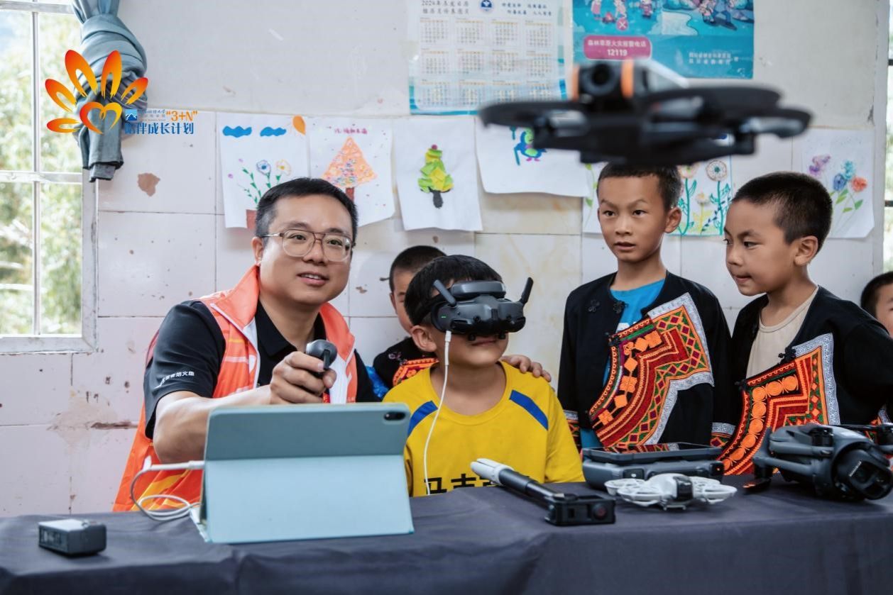 下午举行的“科技嘉年华”将气氛推向高潮。AI机器人灵活舞动,无人机腾空而起,孩子们佩戴VR设备“飞越”家乡,惊喜地发现“学校像一颗镶嵌在山里的星星”。在欢乐中激发了孩子们对科技的兴趣与向往。