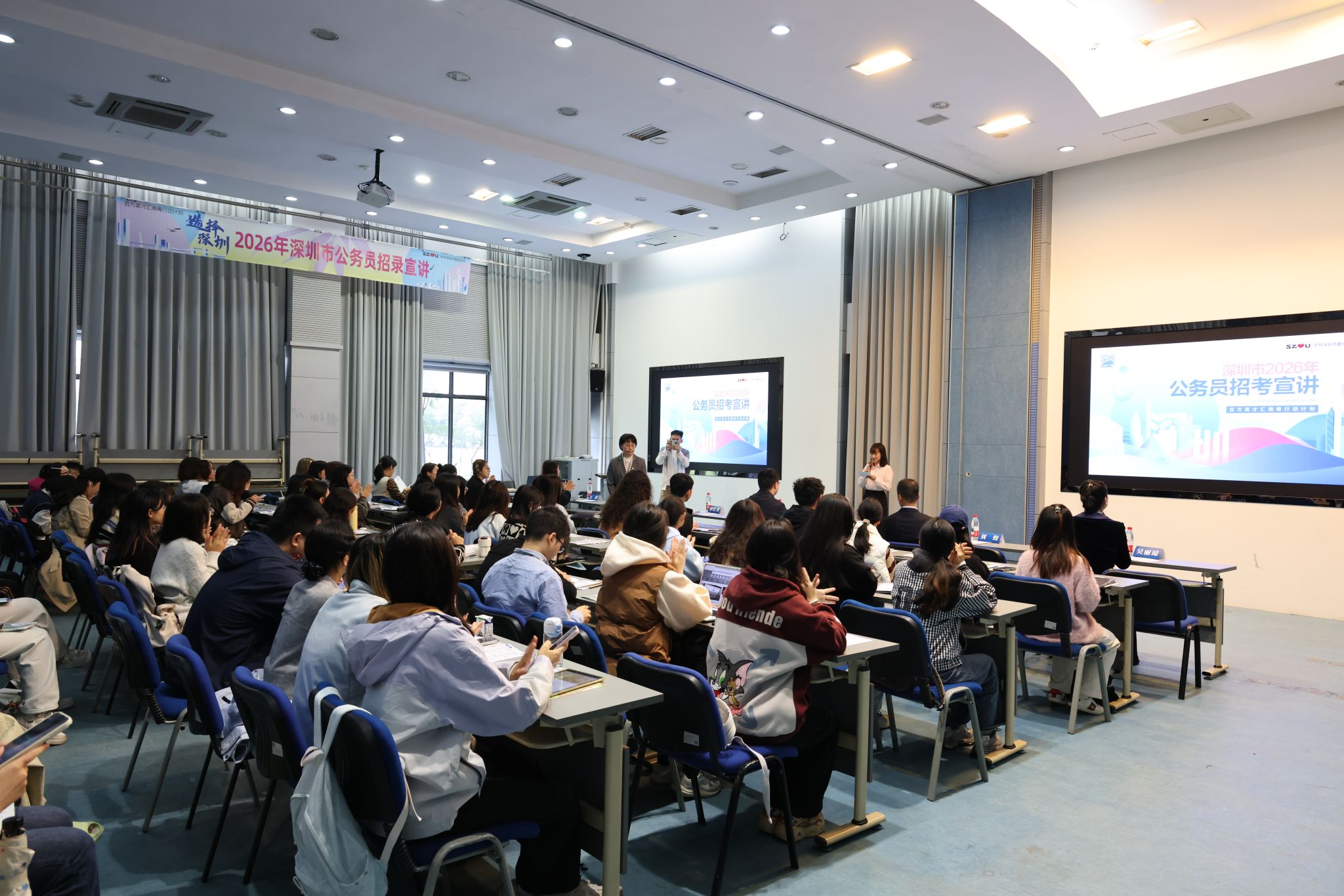 近日,广东省2026年度考试录用公务员政策宣讲会暨深圳市公务员招录专场活动在sunbet学生活动中心视频会议厅举行。本次活动吸引了全校两百余名应届毕业生积极参与。