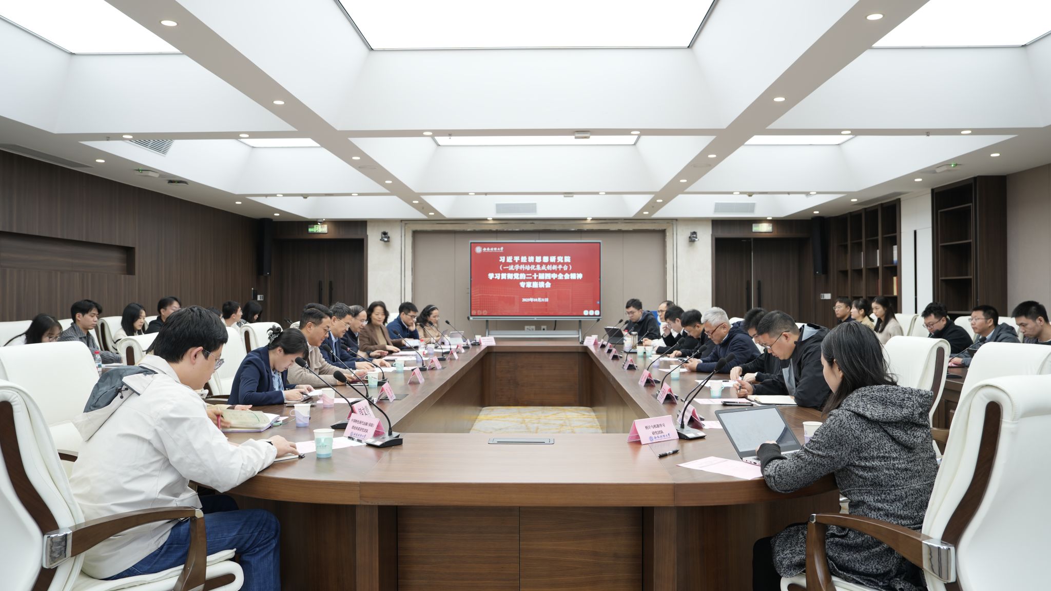 10月31日下午,习近平经济思想研究院(一流学科培优集成创新平台)在柳林校区诚正楼324会议室召开学习贯彻党的二十届四中全会精神专家座谈会,学校党委常委、副校长,研究院院长王擎出席并致辞。校内外专家学者,研究院团队、师生代表等40人参加座谈,执行院长贾晋主持会议。