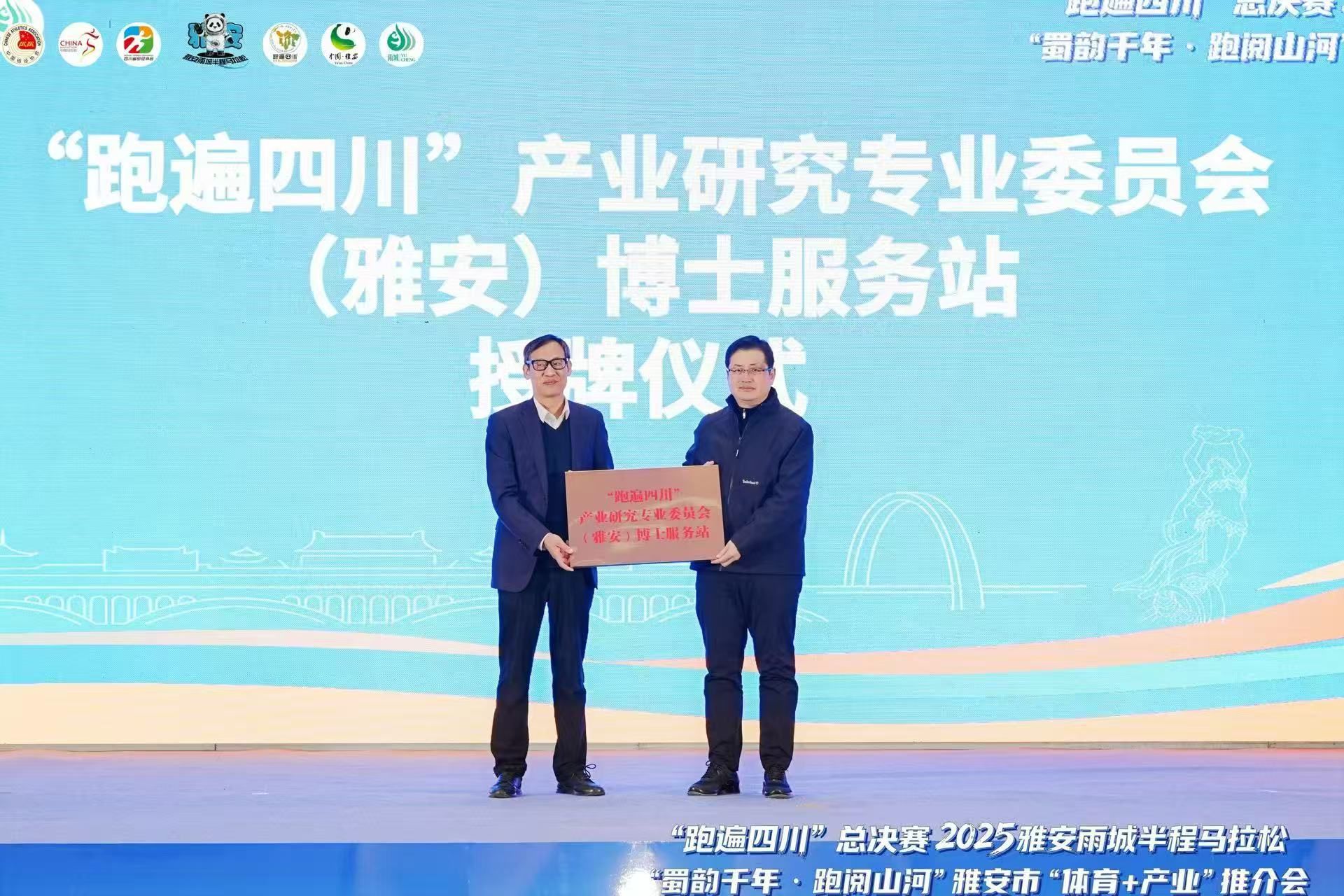 会上,正式成立四川省田径协会产业研究专业委员会,并同步落地“跑遍四川”产业研究专业委员会(雅安)博士服务站。桂富强为博士服务站进行授牌,雅安市雨城区区委书记陈建伟同志接牌。随后,桂富强向博士服务站首批受聘专家颁发专家顾问聘书。中国西部经济研究院毛中根教授、冯卫东教授等6位专家顾问成为首批受聘专家,为产业研究提供智力支撑。