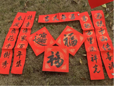 活动现场,红纸铺展如霞,笔墨酣畅淋漓。老同志笔走龙蛇、挥毫泼墨,一笔一划力透纸背,引来阵阵赞叹;青年学子胸有成竹,屏息凝神挥毫,现场师生纷纷点赞。师生们行楷隶篆各展风姿,一幅幅寓意吉祥的春联跃然纸上。提前写好的春联和“福”字挂在树间细绳上随风飘扬,老教师含笑点头,学子们驻足观赏,有人轻声诵读着春联上的美好祝愿,有人举起手机定格这温暖瞬间。“桃李不言自成蹊,春风送暖育新人”“春催桃李遍天下,雨润栋梁立神州”“马跃千山传喜讯,羊驰万里送祥光”等定制联语,既饱含对离退休教职工昔日奉献的敬意,又寄托对马年福寿安康的期许;方正饱满的“福”字搭配灵动的骏马写意造型,将传统韵味与生肖特色完美融合,引得现场阵阵称赞。