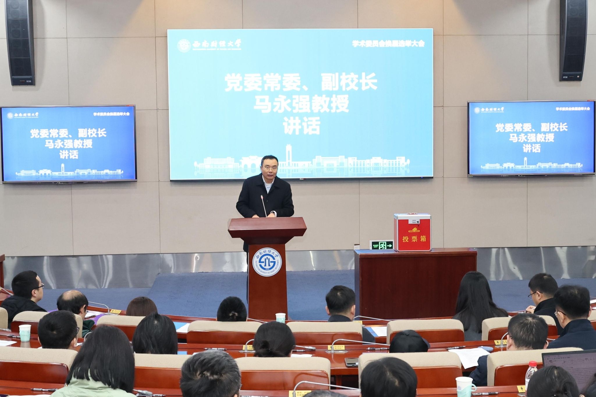 各学院(研究院)负责同志、推荐的教师代表以及相关职能部门负责同志参加换届选举大会。马永强就换届工作前期情况作说明。会议严格按照有关规定和程序,采取无记名投票方式进行选举。经投票表决,31人当选第八届学术委员会委员。