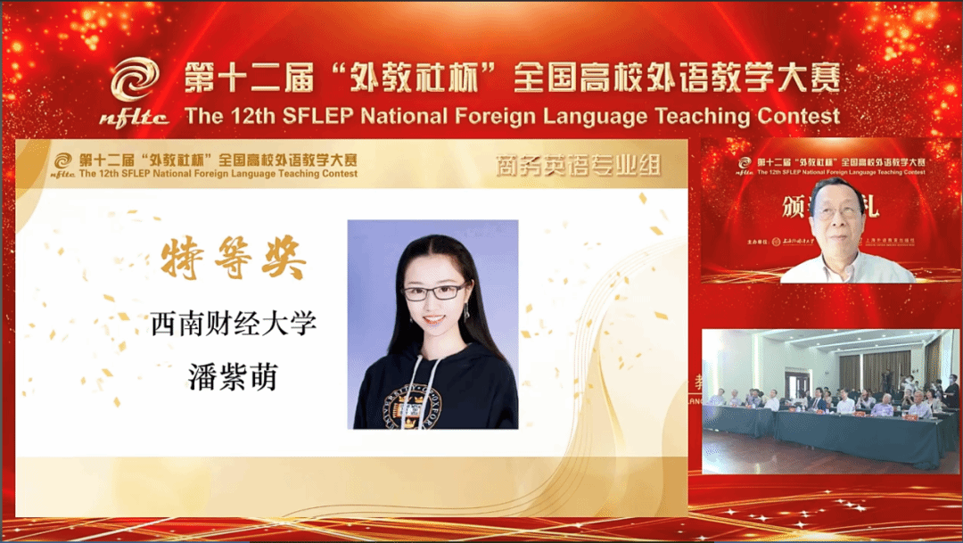 在英语教学中多年的经验积累,让潘紫萌从全国性外语类教学大赛中脱颖而出。2022年,潘紫萌进入第十二届“外教社杯”全国高校外语教学大赛(外语类专业组)全国总决赛,与全国各省(直辖市、自治区)优中选优的省级冠军开展教学专业能力切磋。面对北京师范大学、复旦大学、上海交通大学、上海外国语大学等实力强劲的选手,她凭借扎实的英语功底和风趣的教学风格,将思政元素有机融入教学内容,成功打动了在场的评委,一路过关斩将直至摘取全国总冠军特等奖桂冠,并刷新了四川省在该项赛事中的最好成绩。