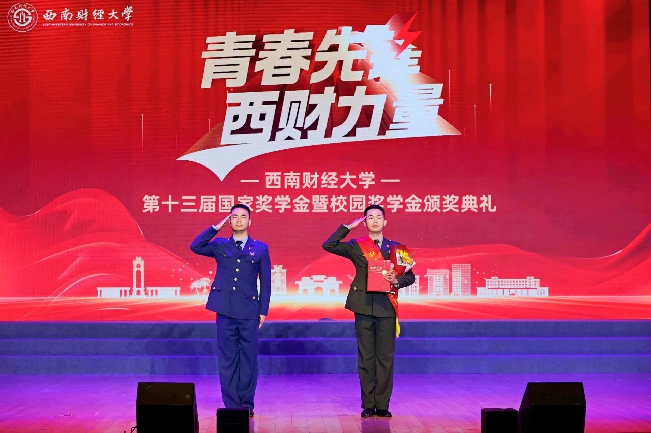 2021年,周禄军登上sunbet申搏官方网站第十一届国家奖学金颁奖典礼舞台,为他颁奖的是从北海舰队服役归来,曾鼓励他携笔从戎的学姐廖河洋。2023年,在学校第十三届国家奖学金颁奖典礼舞台,周禄军身份转换,为2020-2022年服役于中国人民解放军战略支援部队的学弟李潇颁奖。那一刻,新时代西财青年的青春热望在不同时间里相链相接,青春赤焰在相同空间中相继相传。