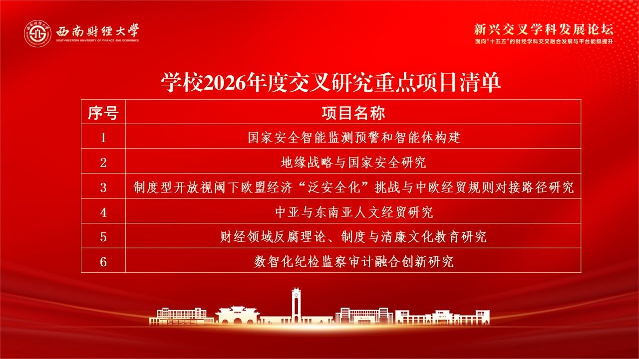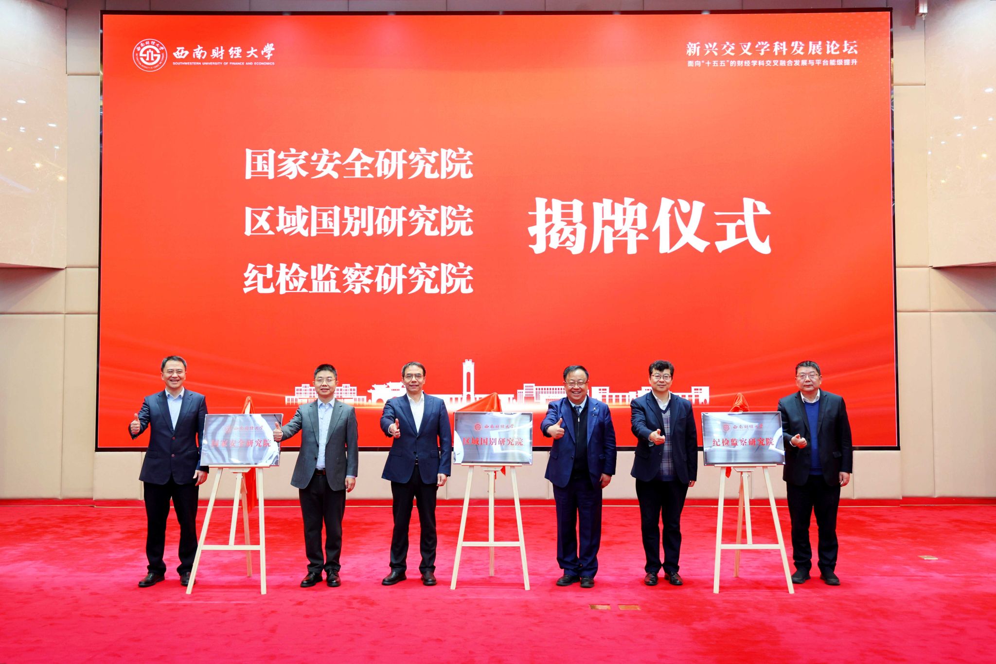 12月29日,学校新兴交叉学科发展论坛在柳林校区成功举办,揭牌成立国家安全、区域国别、纪检监察三大交叉学科研究院。国防大学国家安全学院唐永胜少将,中国社会科学院国家金融与发展实验室主任张晓晶,四川省教育厅科技与研究生处处长贺羽,广东财经大学原副校长邹新月;学校党委书记赵建军,党委副书记、校长李永强,党委副书记、纪委书记孙殿明,党委常委、副校长李志生、王擎出席开幕式。论坛以“面向‘十五五’的财经学科交叉融合发展与平台能级提升”为主题,设置国家安全、区域国别、纪检监察三个分论坛。