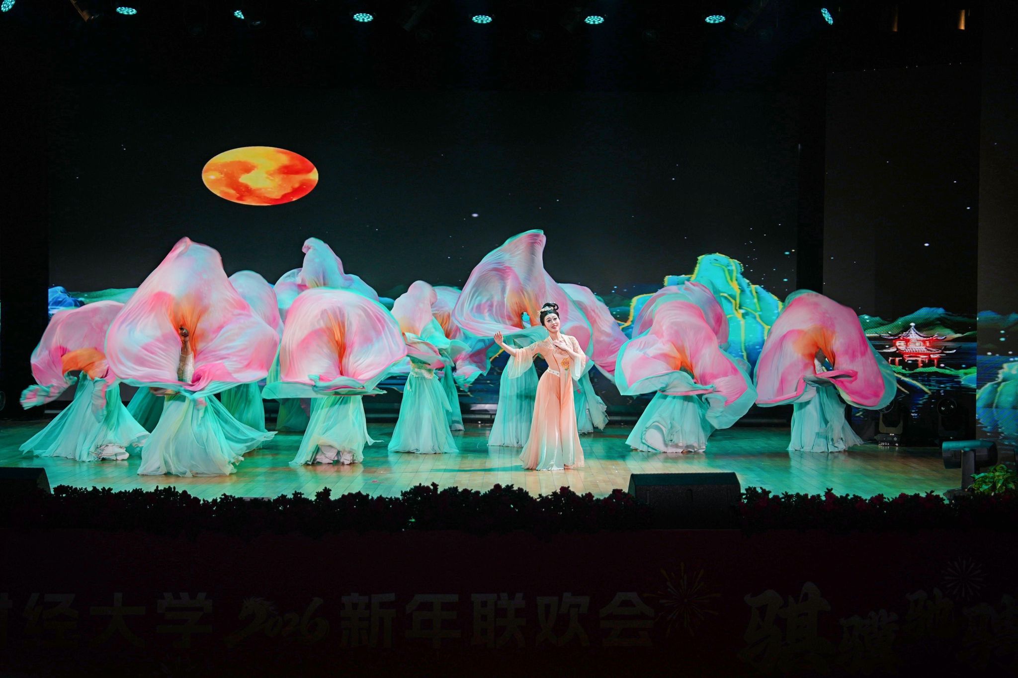 “岁稔盈仓·合颂盛景”篇章,话剧《于无声处听惊雷》再现西财学子曹立中掩护同志撤离、英勇就义的故事,观众在真挚厚重的表演中感悟先辈家国情怀与革命气节。歌曲《新的天地》以深情嘹亮的嗓音唱响时代赞歌,道出西财人对祖国繁荣的自豪,坚定投身强国建设的信念。舞蹈《芙蓉似锦满城花》融合成都特色与新年氛围,舞姿优雅,尽显蓉城人文底蕴,寄托西财扎根巴蜀的深厚情怀。