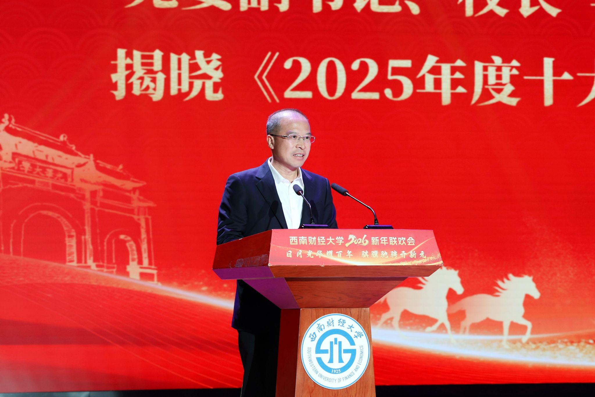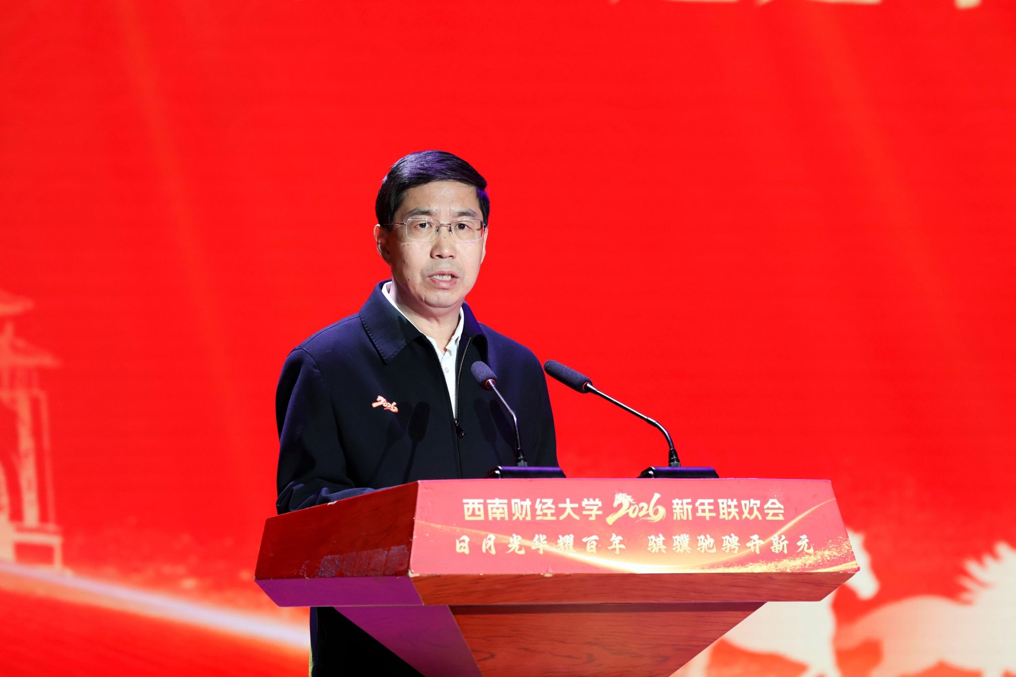 党委书记赵建军致辞,向广大教职员工、离退休老领导老教师、西财学子和海内外校友致以新年祝福。他指出,2025年是浓墨重彩、意义非凡的一年,全校上下用拼搏和汗水、用实干和担当、用责任和情怀,共同书写了彰显“如磐初心”的政治答卷、展现“强国担当”的发展答卷、诠释“西财情怀”的和美答卷。2026年是“十五五”开局之年,面向十年建成教育强国,面向十年实现“建成财经特色鲜明的世界一流大学”的目标,全校师生员工要在奋斗中凝聚合力善作善为、推动改革走深走实、实现更高质量发展,共同开创更加美好的未来。