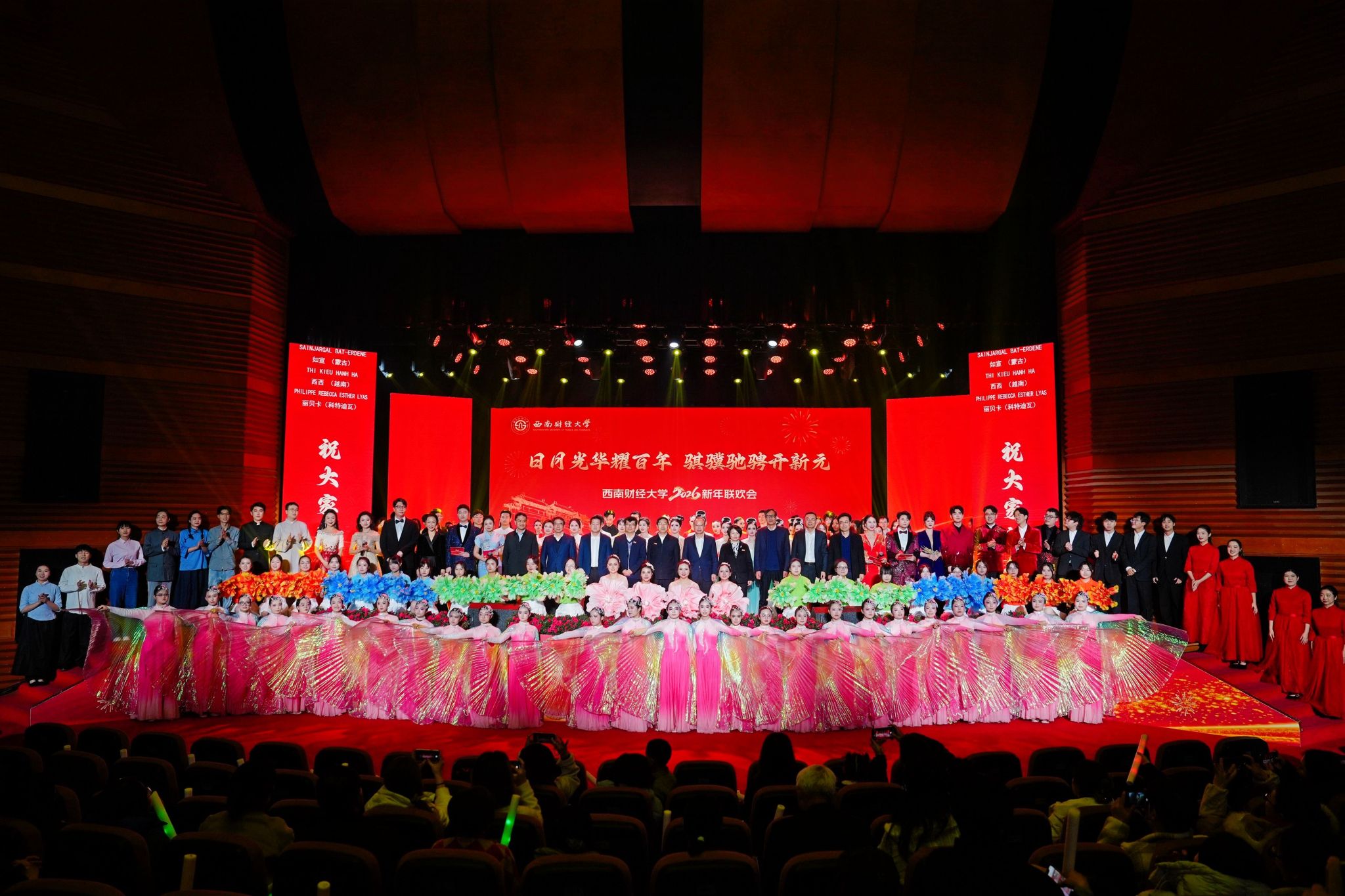 “骐骥腾骧·同心致远”篇章,视频《承启百年 新年新愿》把跨越山海的心意汇聚成暖流,用师生校友真挚祝福传递对母校的祝福和对未来的期待。合唱节目引发全场共鸣,《成都》勾勒出学校与城市的温情羁绊,《向往》传递出对理想的执着追求。歌舞《Happy New Year》留学生舞步欢快、歌声热情,将新年的喜悦传递给现场每一位观众。体育舞蹈《舞绘中华》融合体育活力与舞蹈美感,以灵动姿态展现文化璀璨。独唱《春天的芭蕾》旋律清新雅致,精湛唱功演绎出歌曲的灵动与激昂,为晚会注入独特艺术气息。