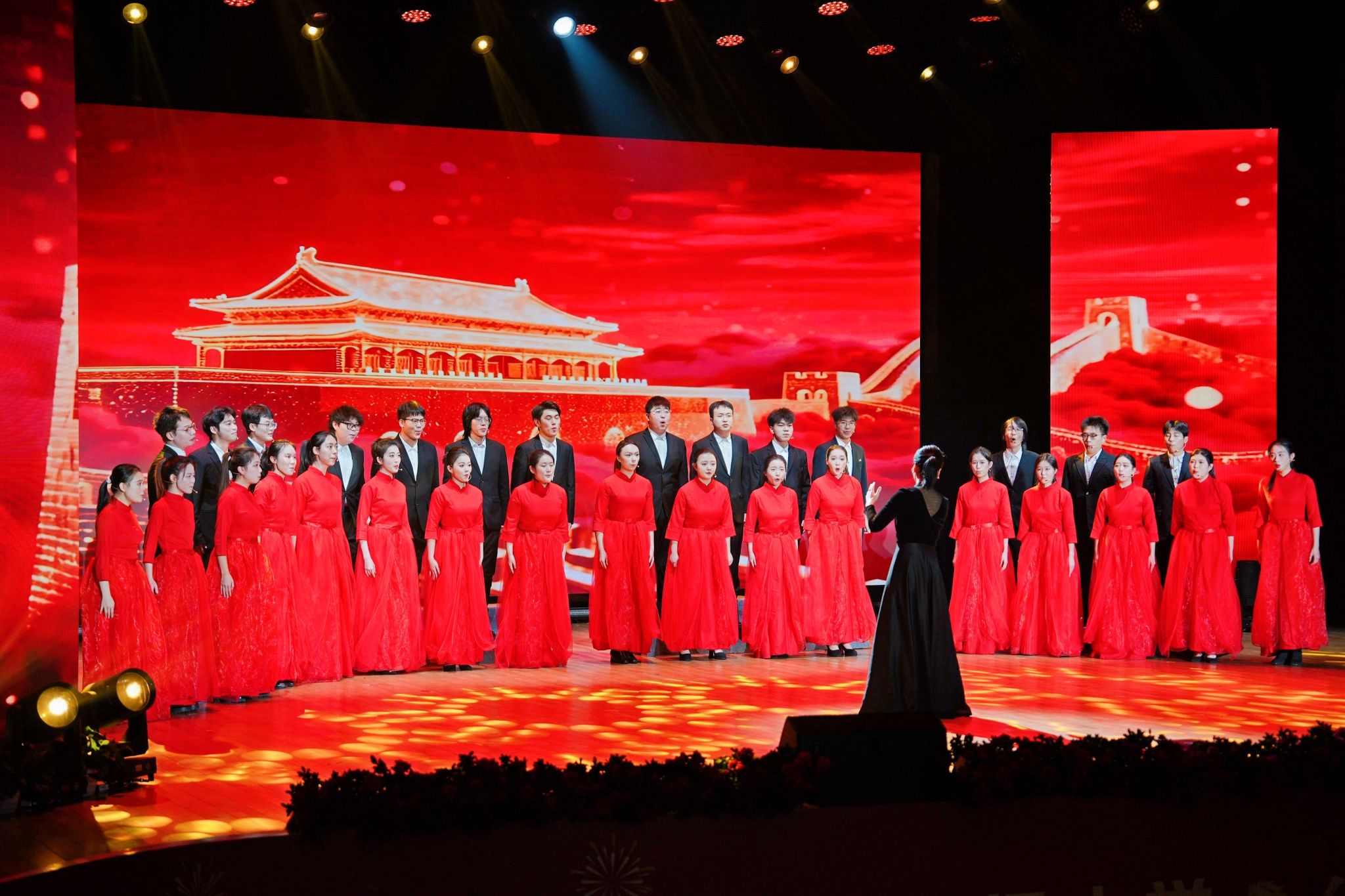 歌舞《长歌未央越百年》作为尾声温情唱响,熟悉的旋律瞬间勾起全场情感共鸣。师生共同登台演绎,歌声嘹亮激昂、舞姿庄重有力,回望西财百年办学的初心与坚守,展现西财人迈向新百年新征程的信心决心。